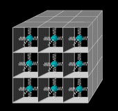 アインシュタインの固体比熱とは,固体比熱の原因を独立した個々の原子の振動に求めるモデルで,数学的には,固体を単一の振動数の調和振動子の集まりとみなしていることになります。熱量はその単振動の強度,古典的に表現を借りれば,その振幅の違いによって計算されます。漫画に描けば,右図のよう⇒。