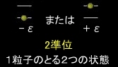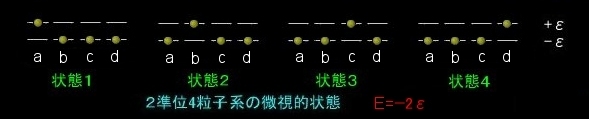 系が(1),(2)を満足する平衡状態にあるとき,粒子一つひとつのエネルギー固有値(±ε)が完全に指定された「微視的状態」は多数存在しますが,ある一瞬を取り出したとき,それらの中のどの状態が実際に実現しているかは等確率であると仮定するのが等重率の原理です。