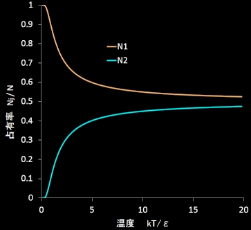この図からは,温度が低いときは下の準位にある粒子が大多数であるが,温度が上昇するにつれて,それが減少し,その分だけ上の準位のある粒子数が増えてゆき,その差はゼロ,すなわち,N1=N2に近づいていくことがみてとれます。
