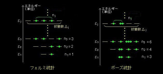 [3] ところが,冒頭で述べた量子力学的な要請(量子統計)[#]から,1つのエネルギー固有状態に入る粒子数 nj について次のような2とおりがあります。