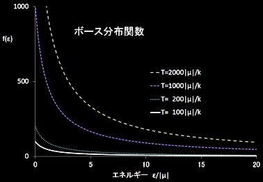 一方,ボースアインシュタイン分布(上図右)は,粒子数に制限がないために比較的高温では,1を超えていくらでも大きな値をとることができます。この分布は,T→0,μ