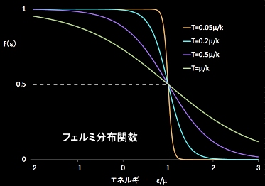 どちらもεに関して単調な減少関数ですが,フェルミ-ディラック分布(上図左)では,f(ε=μ)=1/2の定点を通り,温度が低温になるにつれて,絶対零度で実現するステップ関数[#]に近づいていく様子が見てとれます。そして,絶対零度においては,ε<μの準位では,f(ε)=1,ε>μの準位では,f(ε)=0となり,粒子は低い準位に隙間なくぎっしりと詰まった状態となります。この境界ε=μをフェルミ準位といいます。