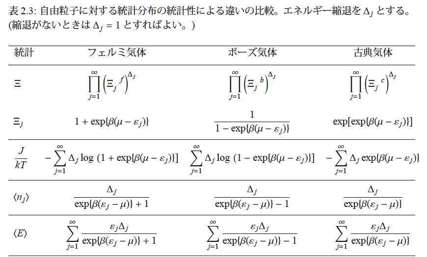 これは量子統計において,(εj−μ)/kT >> 1 であるときの近似となっています。縮退があるときも含めて3つの統計をまとめると,表2.3 のようになります。