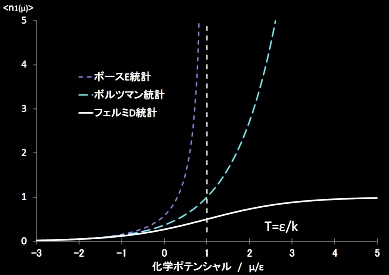 +: フェルミ(-ディラック)分布関数(FD分布) 0: ボルツマン分布 −: ボース(-アインシュタイン)分布関数(EB分布) exp{(εj−μ)/kT}±1