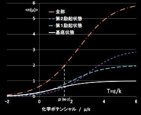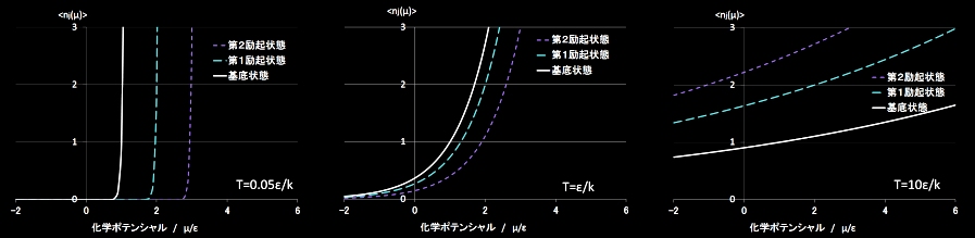 化学ポテンシャルの効果に比べて,温度の効果が無視できません。化学ポテンシャルをマイナス側から増加させていくと,μがまだ,εに達していないマイナスの領域からすべての準位に粒子が入っていくことが分かります。また,比較的低い化学ポテンシャルの領域では,低い準位ほど粒子占有率は高いのですが,化学ポテンシャルが高くなると,第1励起状態,第2励起状態の粒子占有数の上昇率が大きくなり,最終的には,<n1>:<n2>:<n3>= 1 : 2 : 3 へ漸近していくことが分かります。
