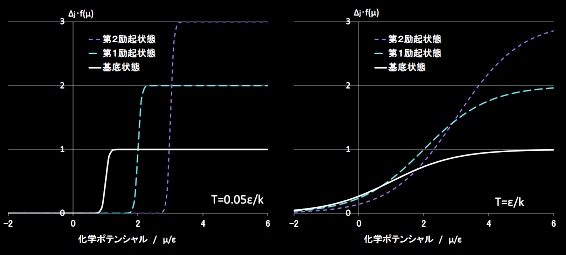 | 各エネルギー準位占有粒子数のμ依存性(フェルミ粒子) | 系の全粒子数のμ依存性(フェルミ粒子) |