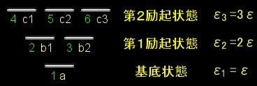 エネルギー固有値は3つあり,上記のとおりとします。第1励起状態は2重に縮退,第2励起状態は3重に縮退しているとします。つまり,固有状態は合計で6個あり,同じエネルギーを持つ微視的状態を区別するためには,第2励起状態は2a,2b,および,第3励起状態は3a,3b,3cという記号も必要に応じて使います。