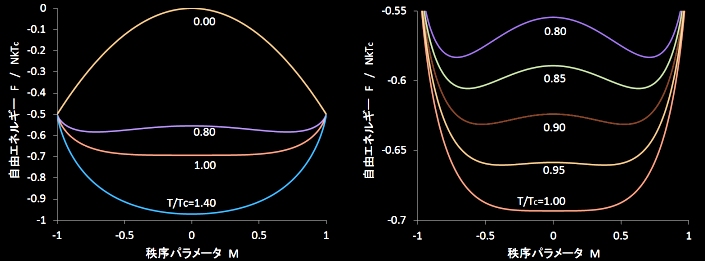 この図からもわかるように低温領域では,M≠0において安定点が2つ存在し,外部磁場がなくてもマクロな磁化を観察することができます。これを自発磁化といいます。
